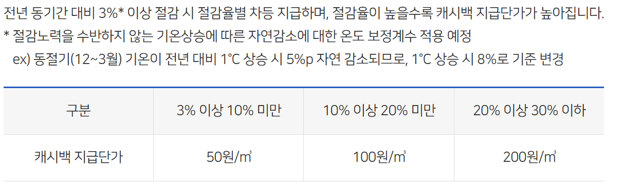 도시가스 절약 캐시백은 동절기(12월~3월) 동안 전년도 대비 도시가스 사용량을 절감한 가정에 대해 절감량에 따라 현금으로 보상해주는 제도입니다.